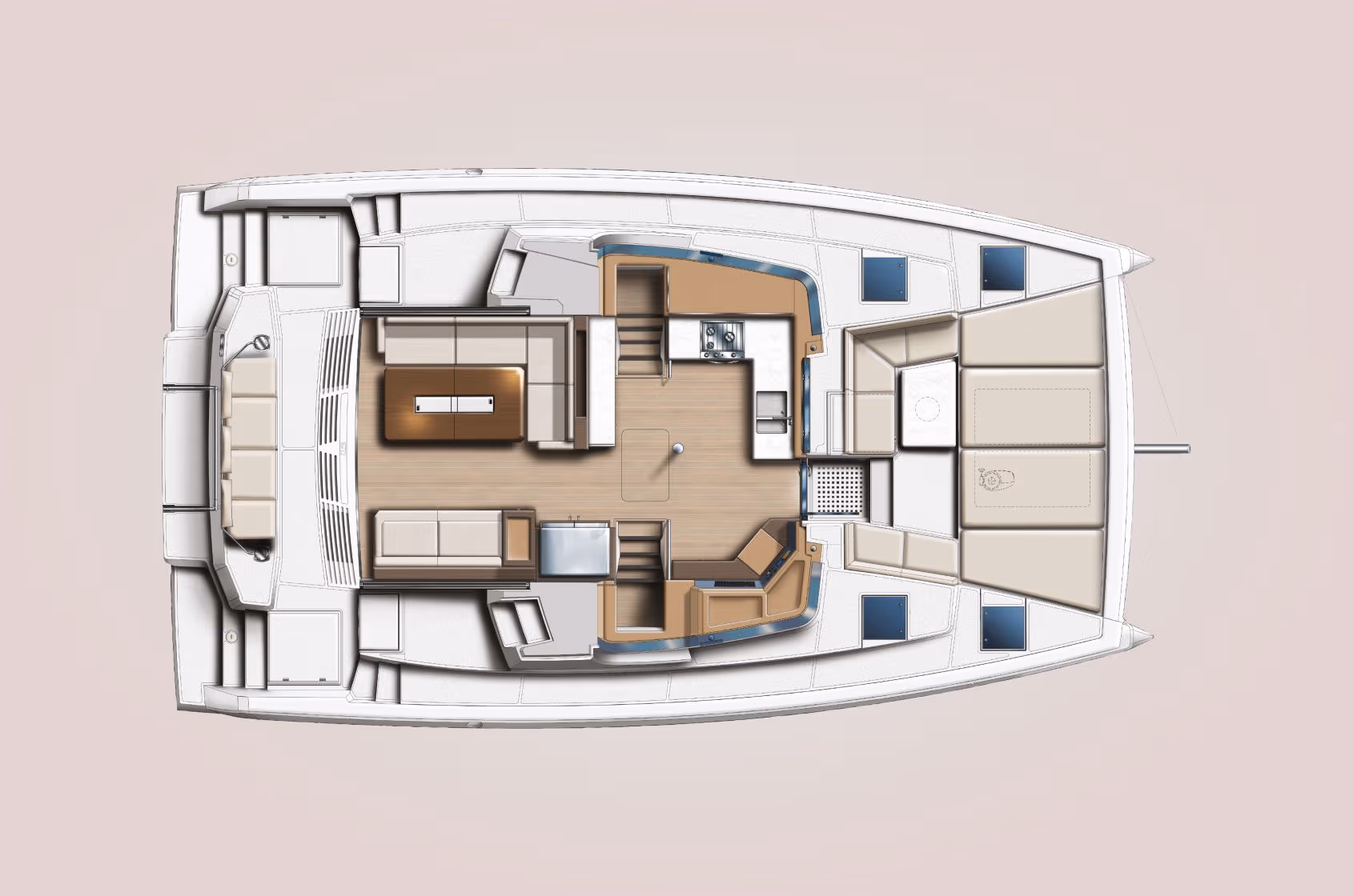 Con 42 pies de elegancia y funcionalidad, este modelo ofrece una combinación perfecta entre rendimiento y comodidad. Su acceso directo al cockpit delantero desde el salón permite una circulación fluida y vistas únicas hacia la proa. La famosa “Bali Door” conecta interior y exterior en un solo ambiente, mientras que la cocina completa, los espacios de almacenaje inteligentes y las opciones de distribución hacen que sea ideal tanto para salidas de fin de semana como para travesías más largas.